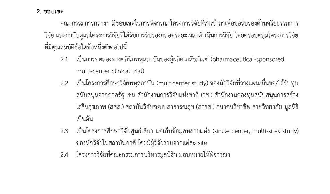 2. เป็นโครงการศึกษาวิจัยพหุสถาบัน (Multicenter study)** ของนักวิจัยที่วางแผน ยื่นขอ หรือได้รับทุนสนับสนุนจาก**หน่วยงานภาครัฐหรือองค์กรสาธารณะ** เช่น สำนักงานการวิจัยแห่งชาติ (วช.), สำนักงานกองทุนสนับสนุนการสร้างเสริมสุขภาพ (สสส.), สถาบันวิจัยระบบสาธารณสุข (สวรส.), สมาคมวิชาชีพ, ราชวิทยาลัย หรือมูลนิธิ เป็นต้น