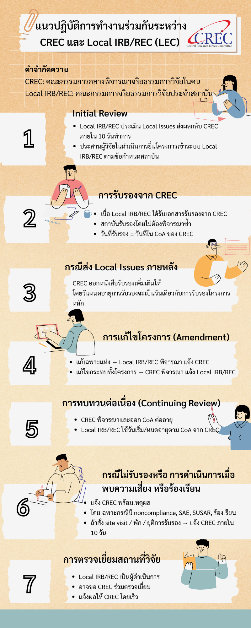 หาก Local IRB/REC ส่ง local issues มาภายหลัง CREC ออกหนังสือรับรองไปแล้ว ทาง CREC จะออกหนังสือรับรองให้สถาบันนั้นเพิ่มเติม