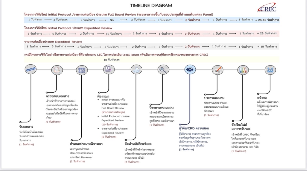 เมื่อ Local IRB/REC ได้รับสำเนาหนังสือรับรอง (Certificate of Approval) จาก CREC แล้ว สถาบันจะดำเนินการพิจารณาให้การรับรองโครงการวิจัยที่ได้รับการรับรองจาก CREC โดยไม่ต้องพิจารณาซ้ำที่สถาบัน หรือพิจารณาอย่างรวดเร็ว โดยการกำหนดวันที่เห็นชอบ/รับรอง ดังนี้